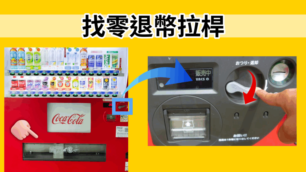 只要按下這個控制桿,你投入的錢就會回到退幣口。即使找零需要一段時間,也只需操作這個控制桿。無需踢機器。