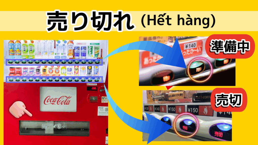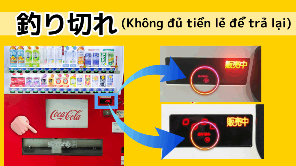 Màn hình “Hết cá”:Điều này cho biết máy không có đủ tiền thừa và việc bán hàng đã tạm thời bị dừng. Thiết kế của biển báo này thay đổi tùy theo máy, vì vậy có thể hơi khó tìm. Bạn có thể mua hàng bằng đúng số tiền hoặc tiền xu nhỏ.