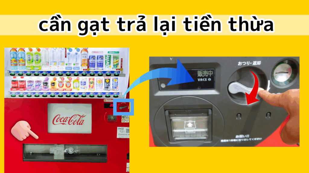 Nếu bạn đẩy cần gạt này xuống, tiền bạn bỏ vào sẽ quay trở lại khe trả tiền. Ngay cả khi phải mất một lúc mới có tiền thừa, bạn chỉ cần đẩy cần gạt này. Không cần phải đá vào máy.
